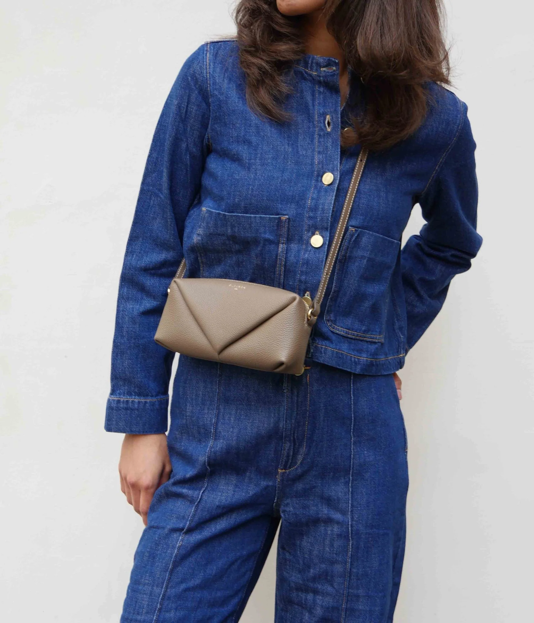 The Mini Trinity shoulder bag from Fleuron in taupe is a versatile choice for any wardrobe. Straddling between brown and grey, taupe brings a contemporary touch to all your outfits. Handcrafted in Italy, this calf leather bag is as functional as it is elegant.
