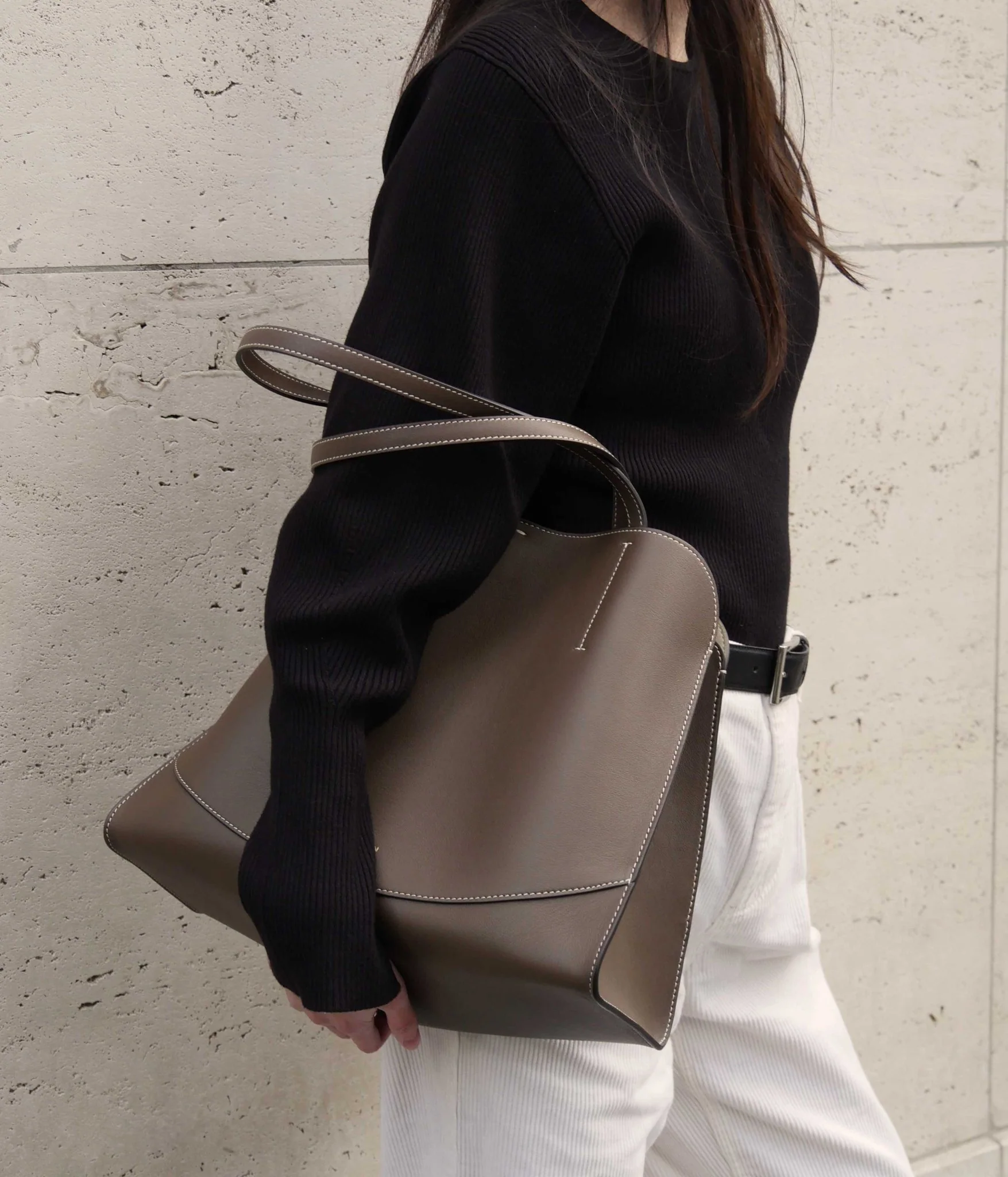 Its Dark Taupe hue, rich and subtle, harmonizes perfectly with a palette of neutral tones such as beige, sand, or light gray, creating a timeless and elegant look. For a bolder and chic contrast, pair it with deep shades like black, adding a touch of modern sophistication. This bag also pairs beautifully with monochromatic outfits in various shades of brown, enhancing a contemporary and refined tone-on-tone appearance.